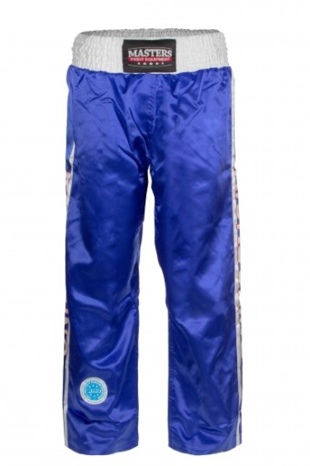 Długie spodnie do kickboxingu. Doskonale sprawdzą się podczas najważniejszych zawodów czy treningów. Szeroka guma w wyróżniającym się kolorze i wewnętrzne sznurki utrzymują spodnie we właściwym miejscu. Bardzo duży klin pozwala na większą swobodę ruchu i wygodę przy noszeniu suspensora. Na jednej nogawce nadruk z polską flagą, a na drugiej logo WAKO - posiadają atest do startu w zawodach kickboxingu.