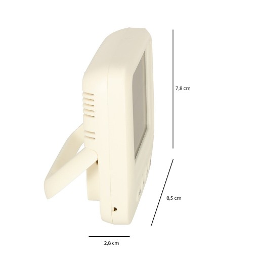 Domowy higrometr z dodatkowymi funkcjami - zegar z budzikiem, termometr. Posiada podpórkę, dzięki czemu można go wygodnie postawić w każdym dowolnym miejscu. Zasilanie: 2 baterie AAA. Wymiary: 8,5 cm x 7,8 cm x 2,8 cm.