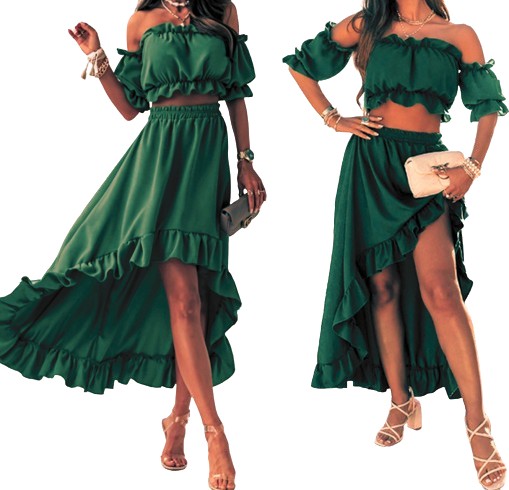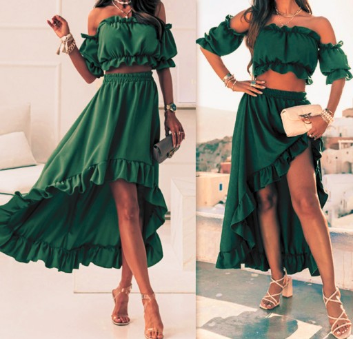 Bluzka o kroju hiszpanki posiada elastyczne gumki w górnej, jak i dolnej części, dzięki czemu perfekcyjnie dopasowuje się do sylwetki. Spódnica wyróżnia się asymetrycznym fasonem, a także dołem wykończonym dziewczęcą falban