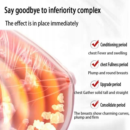 Sposób użycia: Raz rano i raz wieczorem. , Ogrzej piersi ciepłym ręcznikiem przed i po użyciu. , nałóż równomiernie po obu stronach klatki piersiowej. , aby uniknąć otoczki. , przesuwaj ręce po obwodzie klatki piersiowej. Masuj okrężnymi ruchami od zewnątrz do wewnątrz przez 10-15 minut do wchłonięcia.