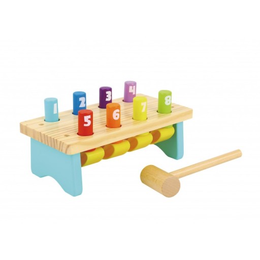 - - zabawka zawiera drewnianą ławeczkę, 8 kolorowych kołków oraz drewniany młotek