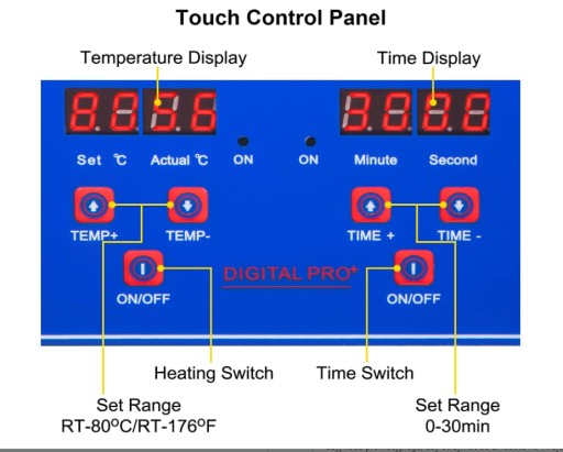 Czas jest regulowany od 0 do 30 minut, a temperaturę można ustawić w zakresie RT-80 ℃, wyświetlaną na ekranach LED.