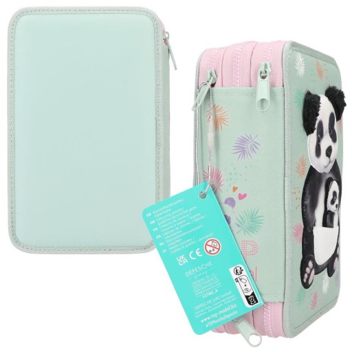 Uroczy miś: jasnozielony piórnik TOPModel ma z przodu dużą pandę z aplikacją i małą pandę w kieszeni kangurki. Jest przymocowany do paska i można go lekko wyciągnąć. Piórnik ma dookoła delikatny, kolorowy wzór liści. Trzy oddzielne przegródki są całkowicie wypełnione 18 kolorowymi ołówkami i pisakami, 2 ołówkami, gumką, temperówką, linijką, nożyczkami, klejem w sztyfcie i małą torebką na rzep. Materiał: 100 procent poliestru