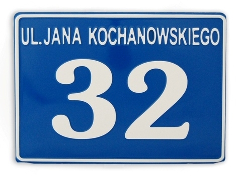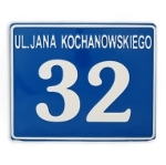 Aluminiowa tablica posesyjna (tłoczona, napisy wypukłe) wykonana z lakierowanej proszkowo (zabezpieczonej) blachy aluminiowej 0,8 mm. Tablica w dowolnym (z dostępnych) kolorze tła oraz z indywidualnym adresem.