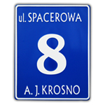Aluminiowa tablica posesyjna (tłoczona, napisy wypukłe) wykonana z lakierowanej proszkowo (zabezpieczonej) blachy aluminiowej 0,8 mm. Tablica w dowolnym (z dostępnych) kolorze tła oraz z indywidualnym adresem.