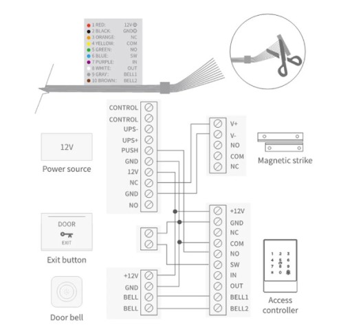 - Magnetic Strike: Elektromagnes blokujący drzwi, sterowany przez zamek.