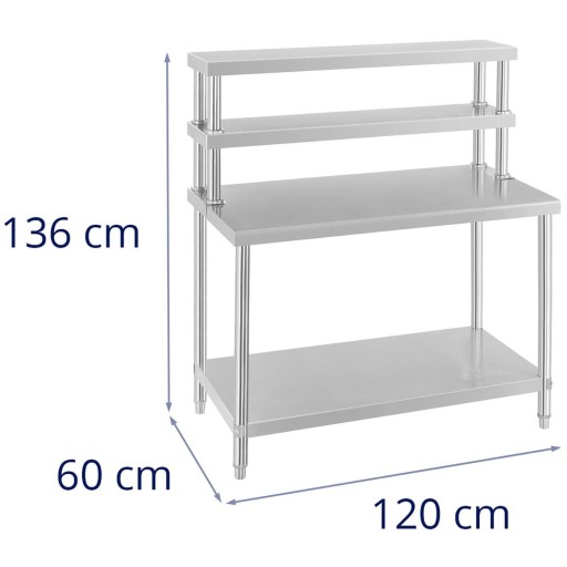 Czteropoziomowa budowa sprawia, że stół roboczy z nadstawką (czyli dwiema półkami nad górnym blatem) zapewnia dużą powierzchnię do pracy i przechowywania produktów. Stół posiada też dodatkową, dolną półkę. To jeden z niewielu dostępnych na rynku mebli gastronomicznych łączących dwie funkcje!