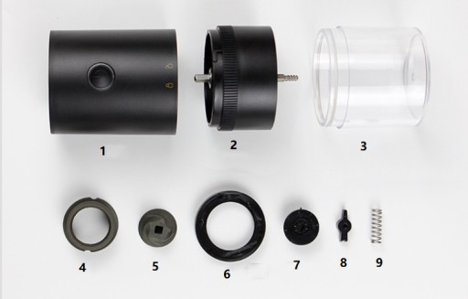 1. Silnik główny 2, pojemnik na ziarna 3, pojemnik na proszek 4, ceramiczna tarcza szlifierska 5, ceramiczny rdzeń szlifierski 6, taca tarczy szlifierskiej 7, gniazdo łożyska 8, regulacja momentu obrotowego 9, sprężyna