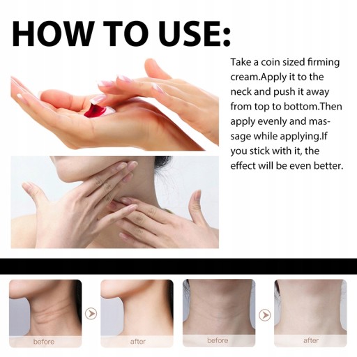 Korzyści: odmłodzenie ujędrnienie skóry wybielanie nawilżający kształt piękno szyi produkty do pielęgnacji skóry
