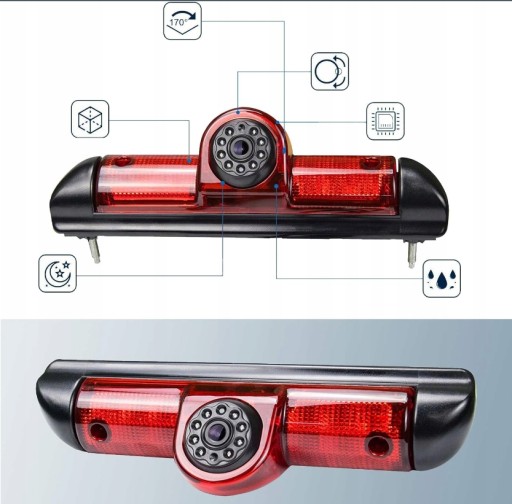 Doskonała kamera cofania z markową kamerą montowaną na tylnym górnym świetle stop (KAMERA WYPOSAŻONA W ŚWIATŁO STOP). Kamera z przetwornikiem SONY wraz z diodami na podczerwień