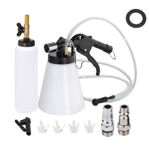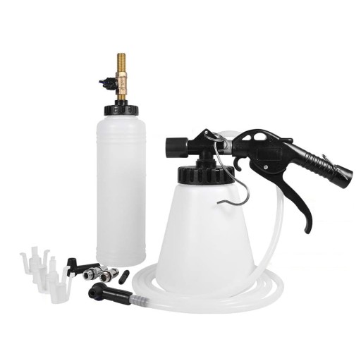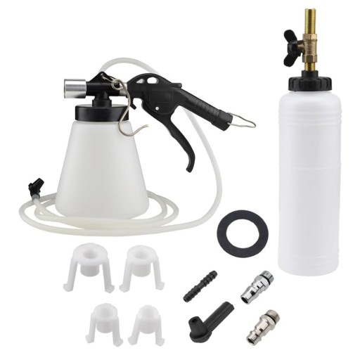 - System ten umożliwia przepłukanie i napełnienie całego 34-uncjowego zbiornika płynu hamulcowego, a także nowego 24-uncjowego zbiornika oleju hydraulicznego.
