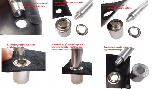 Najpierw wybij otwór w tkaninie za pomocą czarnego dziurkacza. Włóż oczko do otworu. Umieść podkładkę nad zamontowanym oczkiem. Umieść oczko z opaską płasko na podstawie, a następnie umieść srebrne narzędzie montażowe pionowo i uderz młotkiem.