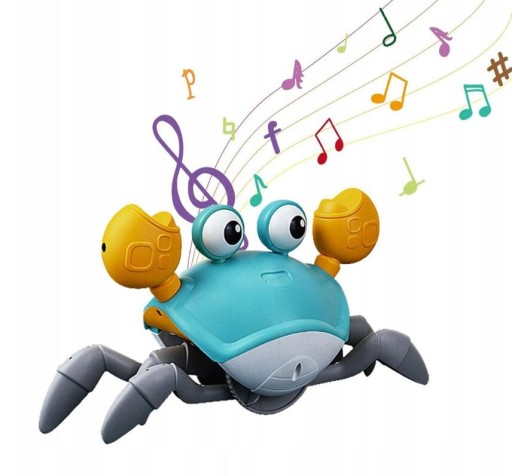- Elektroniczna zabawka muzyczna z motywami krabów zasilana baterią litową 3,7 V, 2 godziny ładowania trwa do 20-30 minut pracy non-stop.