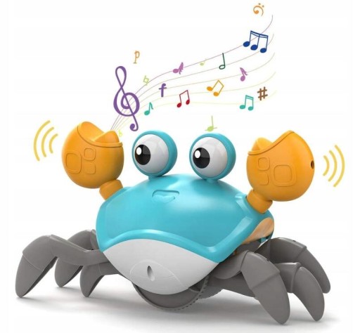 - Zabawka sensoryczna krab posiada światło LED, które działa podczas pełzania oraz czujnik omijania przeszkód.