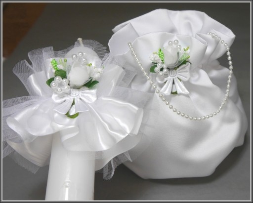 Komplet komunijny w składzie: rękawiczki ozdobione perełkami, okapnik z taśmy satynowej premium i tiulu oraz torebka w kształcie woreczka z satyny ślubnej pierwszego gatunku z perełkowa rączką i ozdobiona przypinką. Torebka posiada wkładkę pomagającą w zachowaniu jej kształtu nawet po wypełnieniu. Do kompletu na naszych pozostałych aukcjach można dokupić pasujący wianek