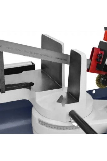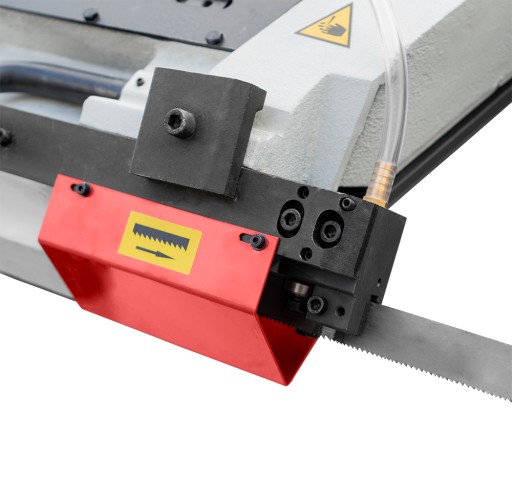 Rama piły wykonana z jednolitego żeliwa oraz szeroka taśma tnąca (27 mm) pozwalają na wykonywanie wieloseryjnych cięć zarówno profili, jak i materiałów stałych. Maszyna posiada uchwyt umieszczony na regulowanym stoliku z szybkim zaciskiem. Efektywna pompa chłodziwa z zamkniętym obiegiem zapewnia optymalne warunki pracy.