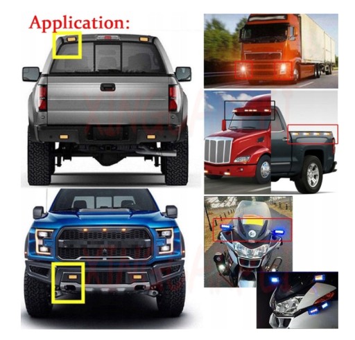 Ostrzegawcze światła stroboskopowe uniwersalne pasują do wszystkich pojazdów z DC 12 V-24 V do samochodów, ciężarówek, quadów, SUV, wozów strażackich, samochodów policyjnych, pojazdów ratowniczych itp. Zainstalowane na przednim/tylnym zderzaku, przedniej szybie, znacznikach bocznych, świetle tylnym, światła przeciwmgielne