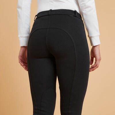 Do jazdy konnej. Sprawdzą się doskonale niezależnie od pogody. Bardzo elastyczne bryczesy 100 są przyjemne w dotyku. Idealne spodnie dla początkujących! Praktyczna kieszeń na udzie.
