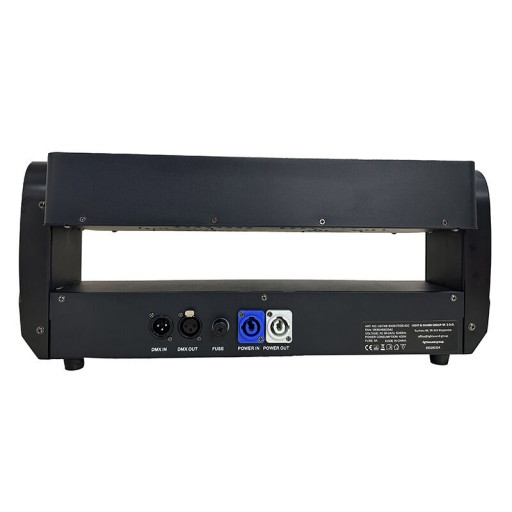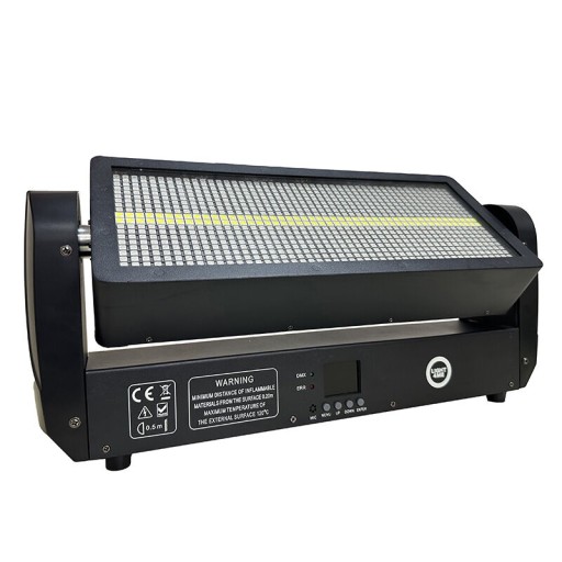 Urządzenie może pracować w pozycji stojącej, a dodatkowo na spodzie obudowy stroboskopu estradowego znajdują się otwory montażowe dla dwóch, trwałych, dołączonych do zestawu uchwytów montażowych, umożliwiających instalację oświetlacza na kratownicach i rampach oświetleniowych. W części tylnej znajdują się gniazda zasilania wejścia i wyjścia powercon, wejście i wyjście dla sygnału DMX. W części przedniej jest umieszczony panel sterowania w postaci cyfrowego wyświetlacza LED i czterech przycisków (Menu, Up, Down, Enter). Za jego pomocą możemy wybrać jeden z czterech trybów pracy oświetlacza: