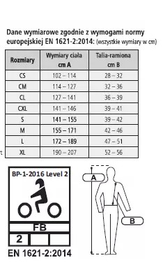 - Kamizelka ochronna zabezpieczająca plecy oraz kość ogonową. Spełnia aktualne normy bezpieczeństwa: EN 1621-2:2014 LEVEL2