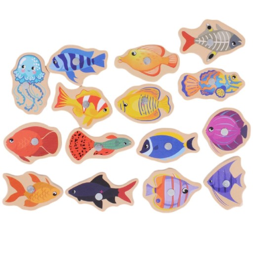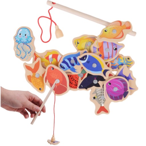 Zestaw składa się z drewnianej wędki oraz 15 kolorowych rybek z magnesem. Twoje dziecko będzie musiało wykazać się sprytem i zręcznością, aby złapać każdą z nich. Zabawa ta rozwija koordynację ruchową, umiejętności manualne oraz koncentrację.