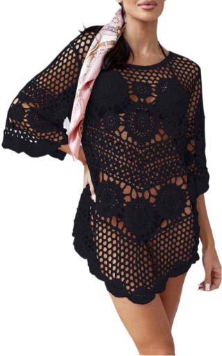 Czarna ażurowa narzutka wykonana z lekkiego przyjemnego w dotyku materiau. Koronkowa tunika z okrągłym dekoltem, rękawki 3/4.