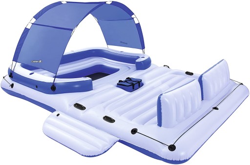 Pływająca wyspa firmy Bestway to komfortowy materac wykonany jest z miękkiego, lecz trwałego materiału PVC Maksymalne obciążenie to aż 540 kilogramów Demontowany daszek sprawia, że wyspa idealnie sprawdzi się zarówno podczas opalania, jak i przy relaksie w cieniu.