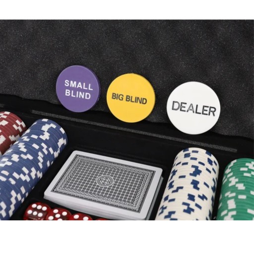 - ŻETONY FUNKCYJNE – do zestawu dołączono zestaw 3 żetonów funkcyjnych, które pozwalają zachować kolejność oraz porządek w grze. DEALER to żeton rozdającego, podczas gry przemieszcza się zgodnie ze wskazówkami zegara. SMALL BIND oznacza pierwszego gracza siedzącego ze Dealerem. BIG BLIND oznacza drugiego gracza siedzącego za Dealerem.
