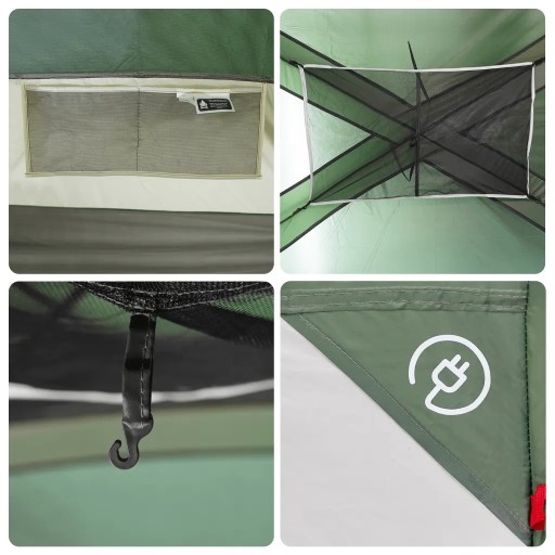 - Odpinany tropik przeciwdeszczowy: zdejmowany tropik można przymocować do górnej części namiotu, aby zapewnić sobie prywatność oraz ochronę przed niekorzystnymi warunkami pogodowymi.