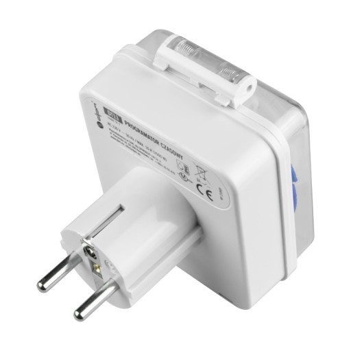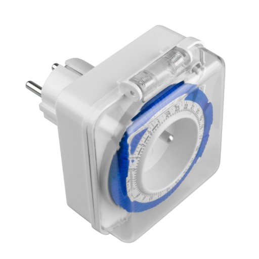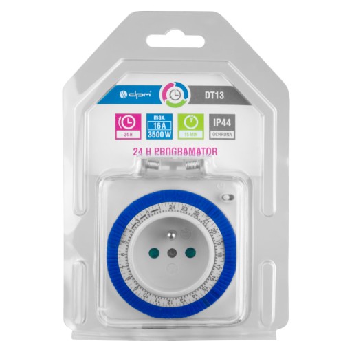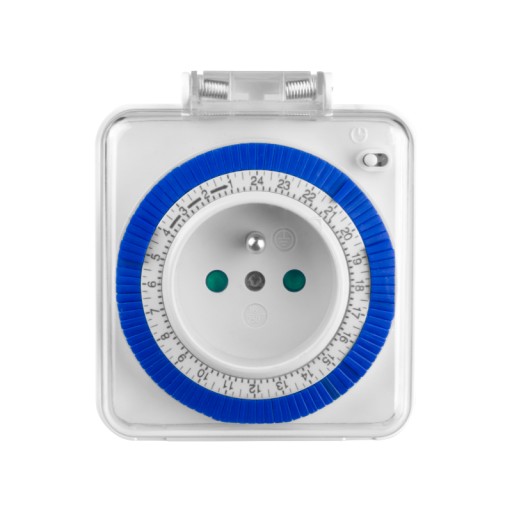 Programator czasowy 24 h analogowy IP44. Gniazdo z uziemieniem 2P+Z. Max. Obciążenie: 16 A (3600 W). Dokładność ustawiania czasu: 15 min. Stopień ochrony: IP44. Kolor: biały. Opakowanie: blister