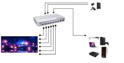 Kontroler ściany wideo 2x3, obsługuje 1- kierunkowe wejście HDMI, 2x wejście USB, 1x wejście Ethernet, slot kart microSD i 6 wyjść HDMI, główną funkcją jest podział pełnego sygnału obrazu HDMI na 6 bloków i przypisanie do 6 wyświetlaczy wideo (takich jak tylna jednostka projekcyjna, telewizor LCD, itp.). Dzięki urządzeniu można stworzyć duży, dynamiczny obraz o wysokiej jakości. Produkt można łączyć kaskadowo, dzięki czemu można rozdzielać obraz na znacznie więcej ekranów. Dodatkową przydatną funkcją kontrolera jest extrakcja audio na wyjście toslink lub jack 3,5mm.