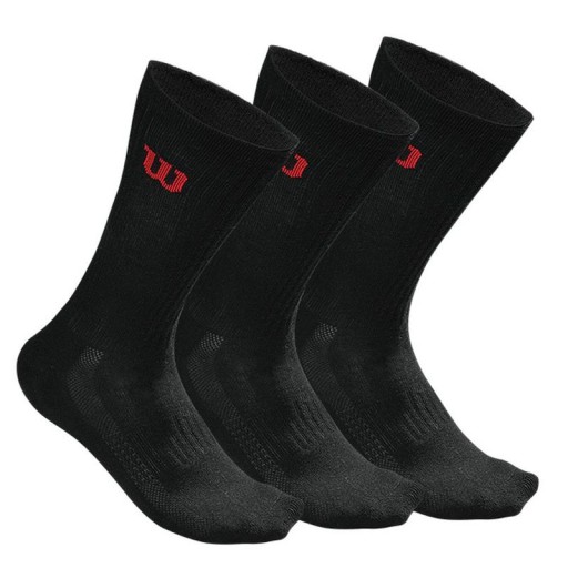 Wilson Crew Socks - uniwersalne skarpety sportowe. Elastyczne ściągacze pozwalają na swobodny przepływ krwi, dzięki czemu mięśnie mają odpowiednią ilość tlenu i mogą wydajnie pracować jednocześnie obniżając uczucie zmęczenia. W skarpetach zastosowano panele pochłaniające i amortyzujące wstrząsy. Kanały wentylujące zapobiegają nadmiernemu przegrzewaniu się i poceniu stopy przez co minimalizują ryzyko występowania odparzeń i otarć naskórka. Technologia bawełny Realcool zapewnia maksymalny komfort, zapewniając chłód i świeżość. Płaskie szwy nie powodują otarć i ucisków co znacznie podnosi komfort w trakcie gry.