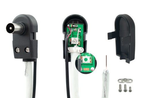 Do prawidłowego działania anteny należy umieścić odpowiednio przygotowany wcześniej przewód koncentryczny we wtyku antenowym przymocowanym do zasilacza antenowego.