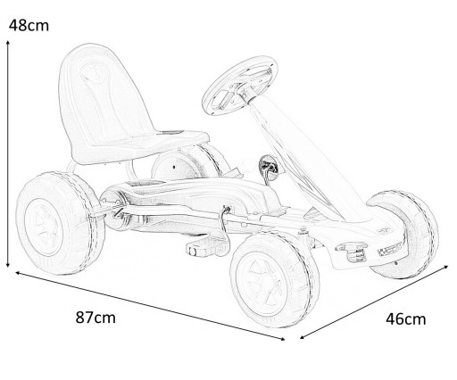 WYMIARY: Wysokość całkowita: 48 cm Wysokość do siedziska: 28 cm Szerokość: 46 cm Długość: 87 cm Długość siedziska: 17cm Wymiary kierownicy: 18x16 cm