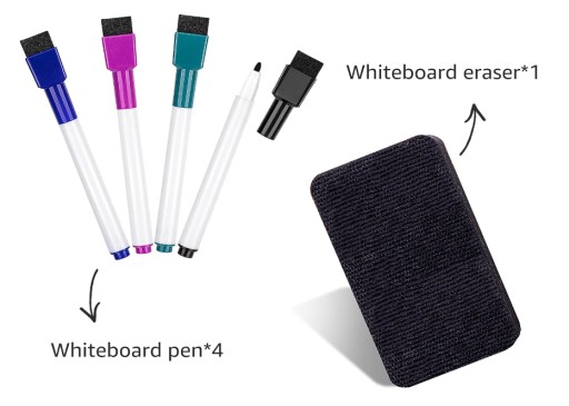- 4 kolorowe markery z magnesem i gąbką - magnes i gąbka znajdują się na zatyczce markera + dodatkowa większa gąbka do scierania