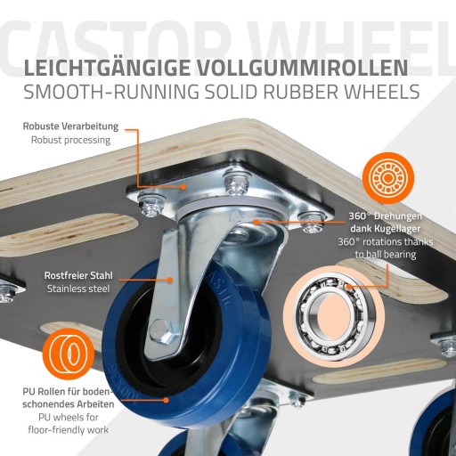 Miękkie, ale wytrzymałe koła z pełnej gumy chronią podłogi przed zarysowaniami. Ponadto duże, wpuszczane uchwyty i 4 płynnie obracające się kółka obrotowe gwarantują dobrą obsługę.