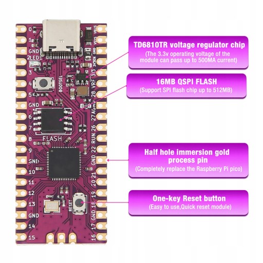 3. Obsługa wielu programów: Pico ma bogatą i kompletną obsługę oprogramowania, jest w pełni kompatybilny z oficjalnym zestawem SDK RasPi C/C++, Micro python SDK. 16 MB wbudowanej pamięci flash QSPI do przechowywania kodu i danych. Maksymalny prąd roboczy wynosi do 500 mA.
