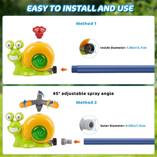 ŁATWA INSTALACJA I UŻYTKOWANIE - Istnieją dwa sposoby podłączenia tego zraszacza ślimakowego: jeden polega na przymocowaniu nakrętki bezpośrednio do gwintowanego węża ogrodowego (średnica nakrętki 1,06 cala/2,7 cm); drugi polega na przymocowaniu dołączonego łącznika do nakrętki, a następnie podłączeniu niegwintowanego węża (średnica zewnętrzna nakrętki 0,59 cala/1,5 cm). Im szybszy przepływ wody, tym wyższa wysokość podstawy strumienia i szerszy strumień dyszy, i odwrotnie.