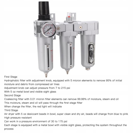 3. Początkowe usuwanie wilgoci: Z pokrętłem regulacyjnym i 5 mikronowymi elementami do usuwania 95% początkowej wilgoci i zanieczyszczeń z przewodów sprężonego powietrza, pokrętło regulacyjne do regulacji ciśnienia od 7 do 215 psi.