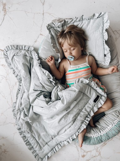 Wyjątkowa dwustronna pościel z falbaną, która dodaje pięknego uroku do pokoju dziecięcego. Pościel wykonana jest z najwyższej jakości bawełny, co gwarantuje miękkość, przyjemność i bezpieczeństwo. W skład kompletu pościeli wchodzi kołderka oraz płaska poduszeczka. Zarówno kołdra, jak i poduszka zostały starannie wykonane z miękkiej bawełny. Pościel jest starannie zaprojektowana przez mamę z myślą o praktyczności i estetyce dla swojego bobaska.