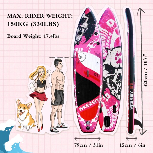 Mierzący 10'6" długość x 31" szerokość x 6" grubość, zrównoważenie i stabilizacja na desce jest dziećmi prostymi, nadaje się do pływania na pływającej wodzie, brzegu morza, jeziorze itp.
