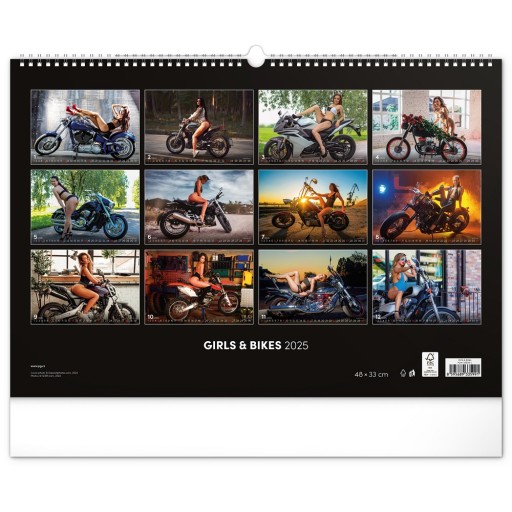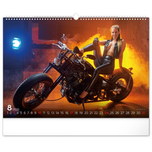 Kalendarz dla miłośników kobiet i potężnych maszyn. Dwanaście podniecających fotografii pięknych dziewczyn pozujących z błyszczącymi motocyklami na stronach kalendarza ściennego w formacie poziomym. Zawiera kalendarz uniwersalny.
