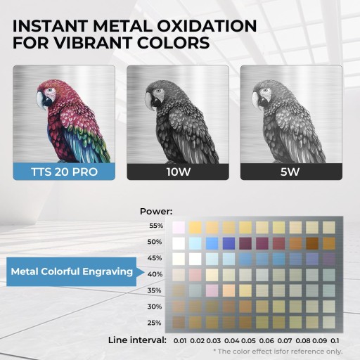nasze grawerki laserowe o mocy 20 W skracają czas grawerowania i cięcia o 50–80% w jawnych modelach o mocy 10 W. Możliwość tworzenia żywych kolorowych grawerów na powierzchniach blachy dzięki zaawansowanej 256-bitowej skali. szukaj możliwości i przyćmij zastępcze czyszczenie metali.