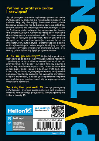 Język programowania ogólnego przeznaczenia Python należy obecnie do najpopularniejszych na świecie. Skąd się bierze jego fenomen? Niewątpliwie kluczowe znaczenie ma tu bardzo czytelna składnia, mocno zbliżona do składni języka naturalnego. Czyni to Pythona dość łatwym do opanowania, także dla początkujących. Osoby bardziej doświadczone doceniają go za wszechstronność. Pythona można używać w różnych dziedzinach, takich jak analiza danych, sztuczna inteligencja, tworzenie stron internetowych, automatyka i automatyzacja, pisanie aplikacji mobilnych i wiele innych. Dodajmy do tego rozbudowany pakiet bibliotek standardowych i oto mamy (niemal) idealny język programowania.A jak się go nauczyć? Najlepiej w praktyce. Rozwiązując zadania i weryfikując własne rezultaty z podanymi w tym zbiorze rozwiązaniami. Autor przygotował ten zeszyt ćwiczeń tak, by zawrzeć w nim wyzwania nieco prostsze, przeznaczone dla mniej zaawansowanych adeptów Pythona, jak i bardziej złożone, wymagające lepszej znajomości zagadnienia. Każde zadanie ma wyraźnie określony stopień trudności, a także jest opatrzone tagami pozwalającymi się zorientować w wymaganiach omawianej tematyki. Sugerują one obszar wiedzy, którą można się posłużyć podczas rozwiązywania.