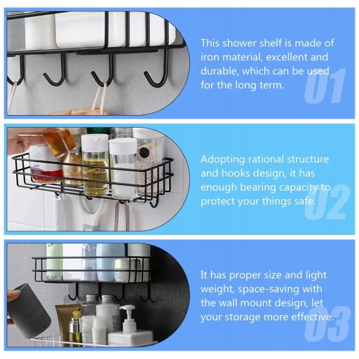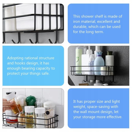 Jest to wieszak ścienny do łazienki. Prosta konstrukcja i łatwa instalacja, mogą utrzymać porządek w łazience lub kuchni. Ma rozsądną konstrukcję, możesz łatwo przechowywać produkty higieniczne, kosmetyki, produkty do pielęgnacji skóry, przybory kuchenne i wiele innych. Również haczyki mogą pomóc w zawieszeniu niektórych rzeczy, takich jak kule prysznicowe, ręczniki itp.