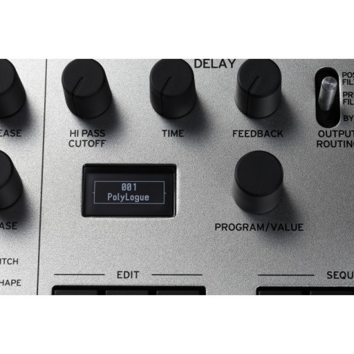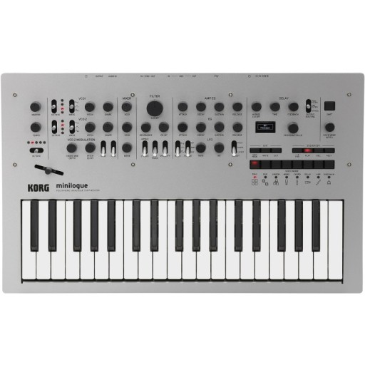 KORG MINILOGUE analogowy polifoniczny syntezator nowej generacji Minilogue jest wyposażony w nowo zaprojektowany obwód syntezy analogowej oferujący m.in. polifonię 4 głosową i możliwość zapisywania presetów – co odpowiada dzisiejszym potrzebom muzyków. Minilogue umożliwia grę potężnymi brzmieniami jakie oferuje jedynie prawdziwy analog oraz inspiruje swoimi funkcjami, takimi jak: polifoniczny step i motion sekwencer, tape-style delay, różnorodność kreacji brzmień, side chain, filtry i oscyloskop na wyświetlaczu. Wszystkie te cechy sprawiają, że minilogue jest potężnym narzędziem, który daje ogromną frajdę z gry, a zarazem jest prosty w obsłudze. Jest to syntezator analogowy nowej generacji dla muzyków grających w każdym gatunku muzycznym. Cechy główne: - elastyczny, potężny, 4 głosowy analogowy syntezator - w pełni programowalny, 200 presetów (100 brzmień zapisanych fabrycznie) - Voice Mode umożliwia elastyczne konfigurowanie 4 głosów - zautomatyzowany 16 polifoniczny step i motion sekwencer - oscyloskop przedstawia wizualnie aktualny przebieg fali - stylowy design z aluminiowym panelem przednim oraz drewnianym panelem tylnym - MIDI, USB MIDI, oraz Audio Sync dla wszystkich typów połączeń studyjnych i koncertowych, zawiera bezpośrednie wyjście sync dla SQ-1, VOLCA, ELECTRIBE i innych STRONA PRODUCENTA