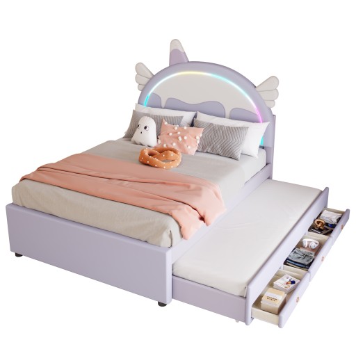 Łóżko dziecięce 140*200cm, kształt jednorożca, wyposażone w wysuwane łóżko, materiał PU, fioletowy