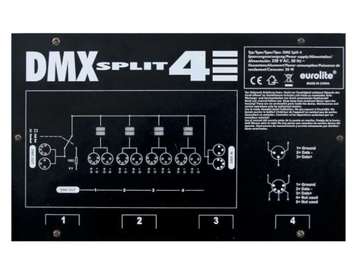 - Rozgałęźnik DMX do dzielenia jednego sygnału wejściowego DMX na 4 wyjścia DMX