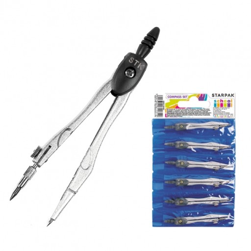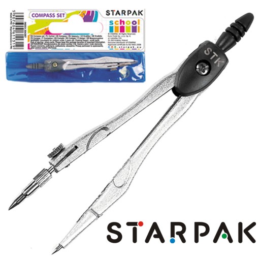 Cyrkle metalowe wykonane z trwałego materiału, wykończone czarnym plastikiem z wymiennymi rysikami. Cyrkle szkolne w foliowym opakowaniu z zawieszką.