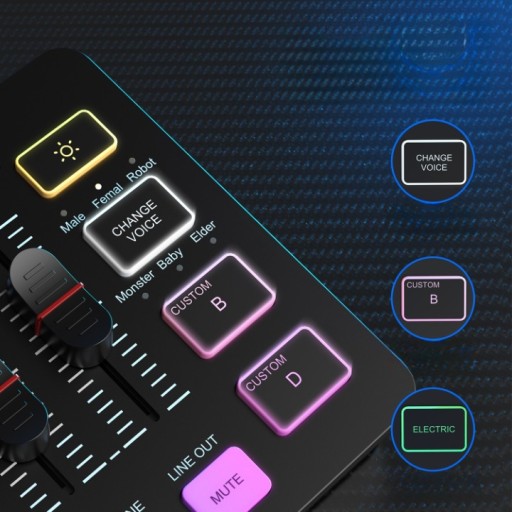 Przycisk RGB na mikserze audio DJ pasuje do różnych tematów strumieniowych na żywo. Światła na mikserze wideo są żywe, ale nie są twarde dla oczu. Płynna lub zamrożona zmiana kolorów RGB w odpowiednim tempie prezentuje silne wrażenie jako "pokaz świetlny" dla odbiorców. Nawet akcesoria do przesyłania strumieniowego nie będą nudne podczas produkcji wideo.